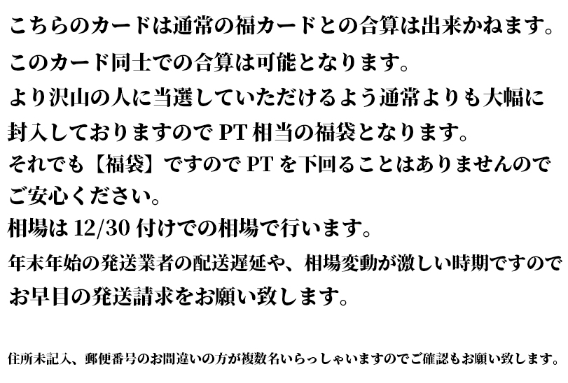 大量発送のタイミングが重なり在庫切れになってしまった場合にBOX以外は鑑定付きアプリなどで購入する場合がございますのでご了承ください。